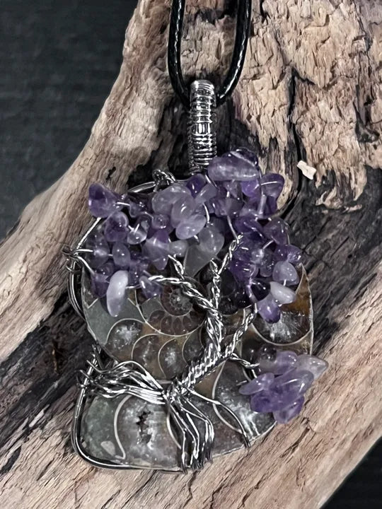 A stunning tree of life design, made with wire and Amethyst crystal chips, sits beautifully on a chunk of raw Amethyst. Check out the natural patterns in the raw Amethyst, just gorgeous.