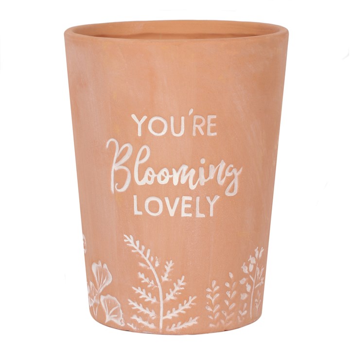 Beautiful and stylish terracotta plant pot featuring the words 'You're Blooming Lovely'. This item would be a lovely gift for Mother's Day or for a much-loved auntie, grandmother or friend.