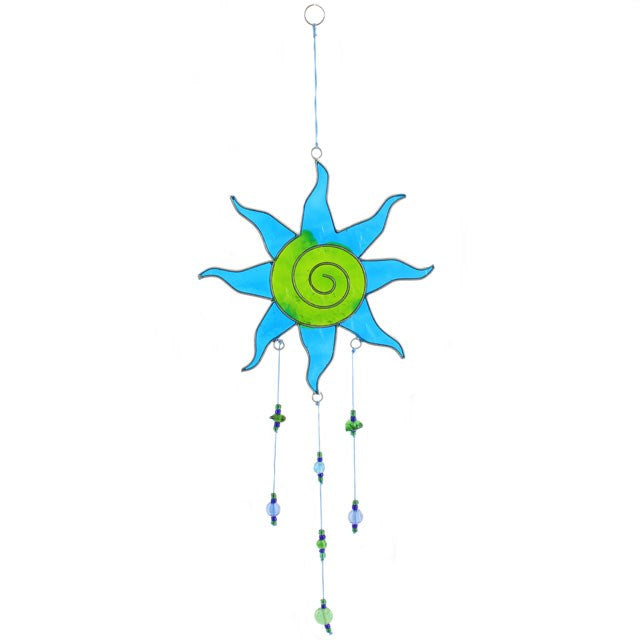 This vibrant suncatcher comes in the shape of a cheerful blue and green sun with three strings of matching glass beads attached. Beautifully catches the sunlight and would look lovely in any window or garden space. Hang in a sunny spot to catch the light. Made from metal, glass and resin. Ethically sourced.