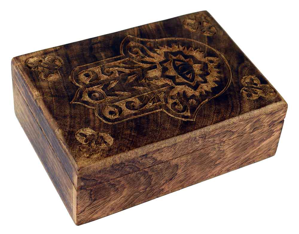 This beautiful carved natural wood box features the hand of Fatima. Measuring 7 x 5 inches, it's perfect for storing jewellery, incense, trinkets etc.