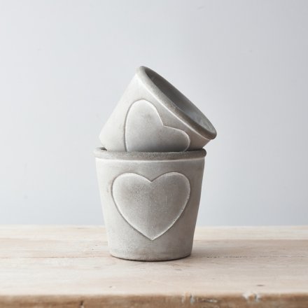 A rustic grey and white pot planter with an embossed heart design.