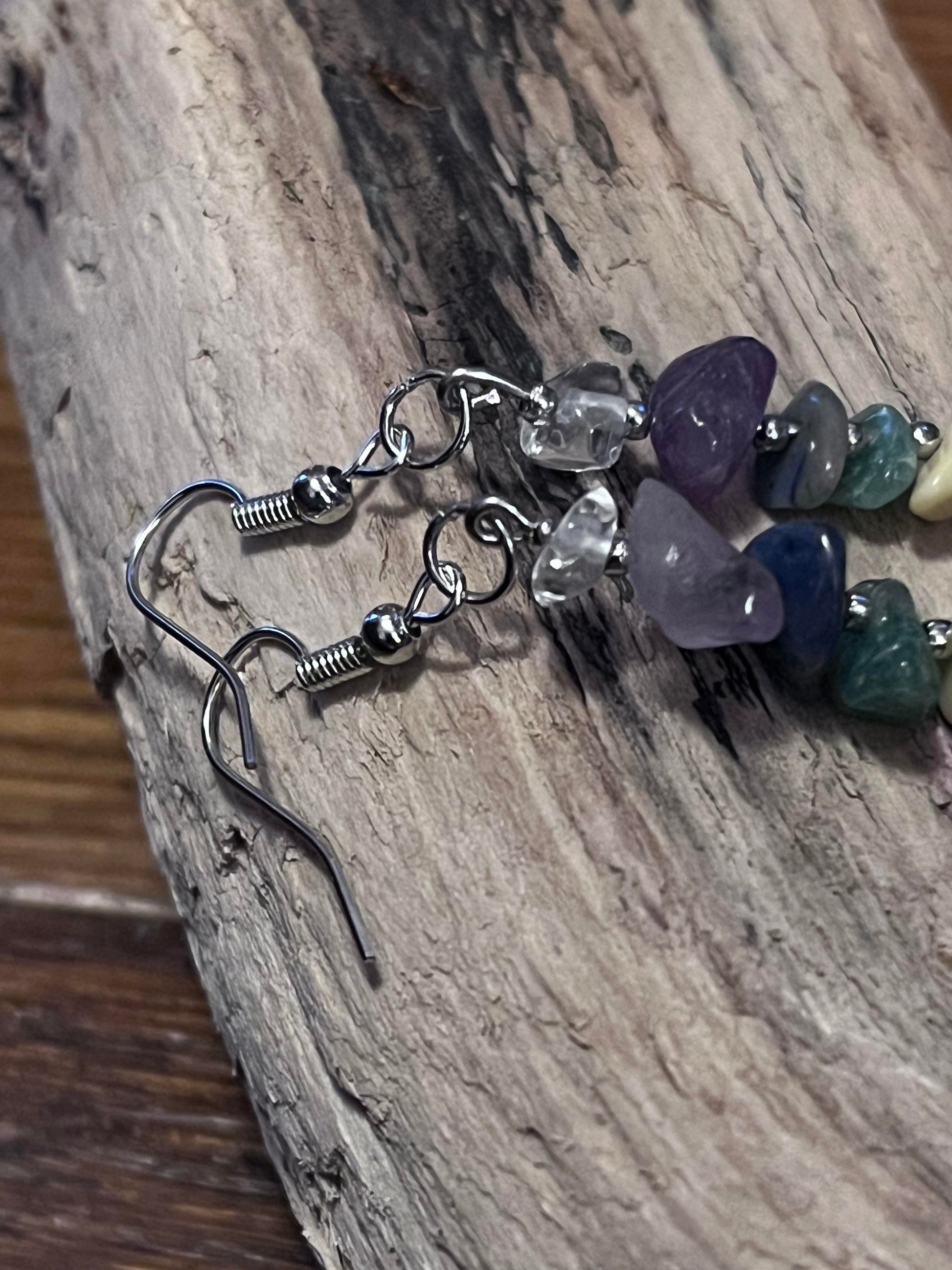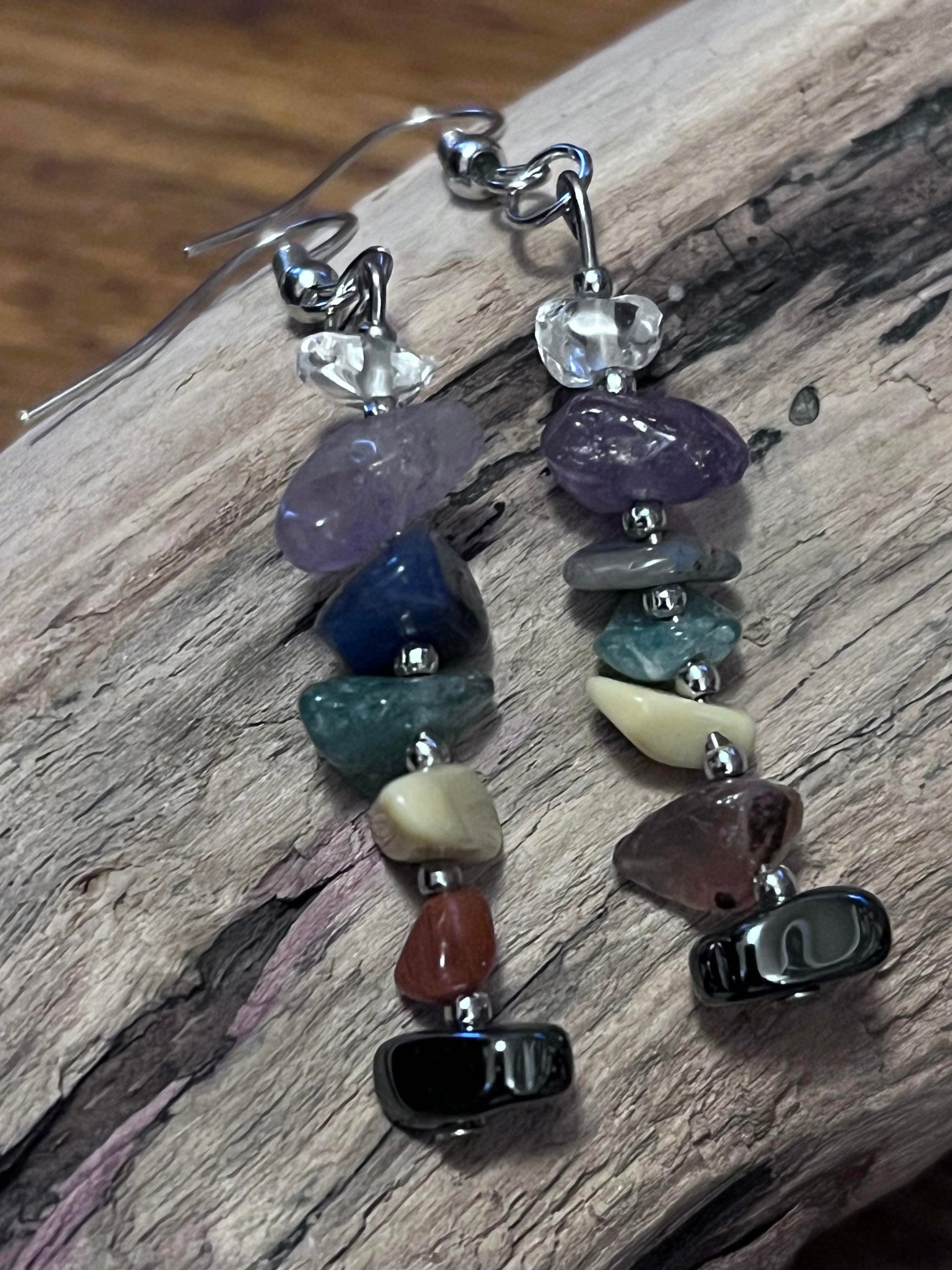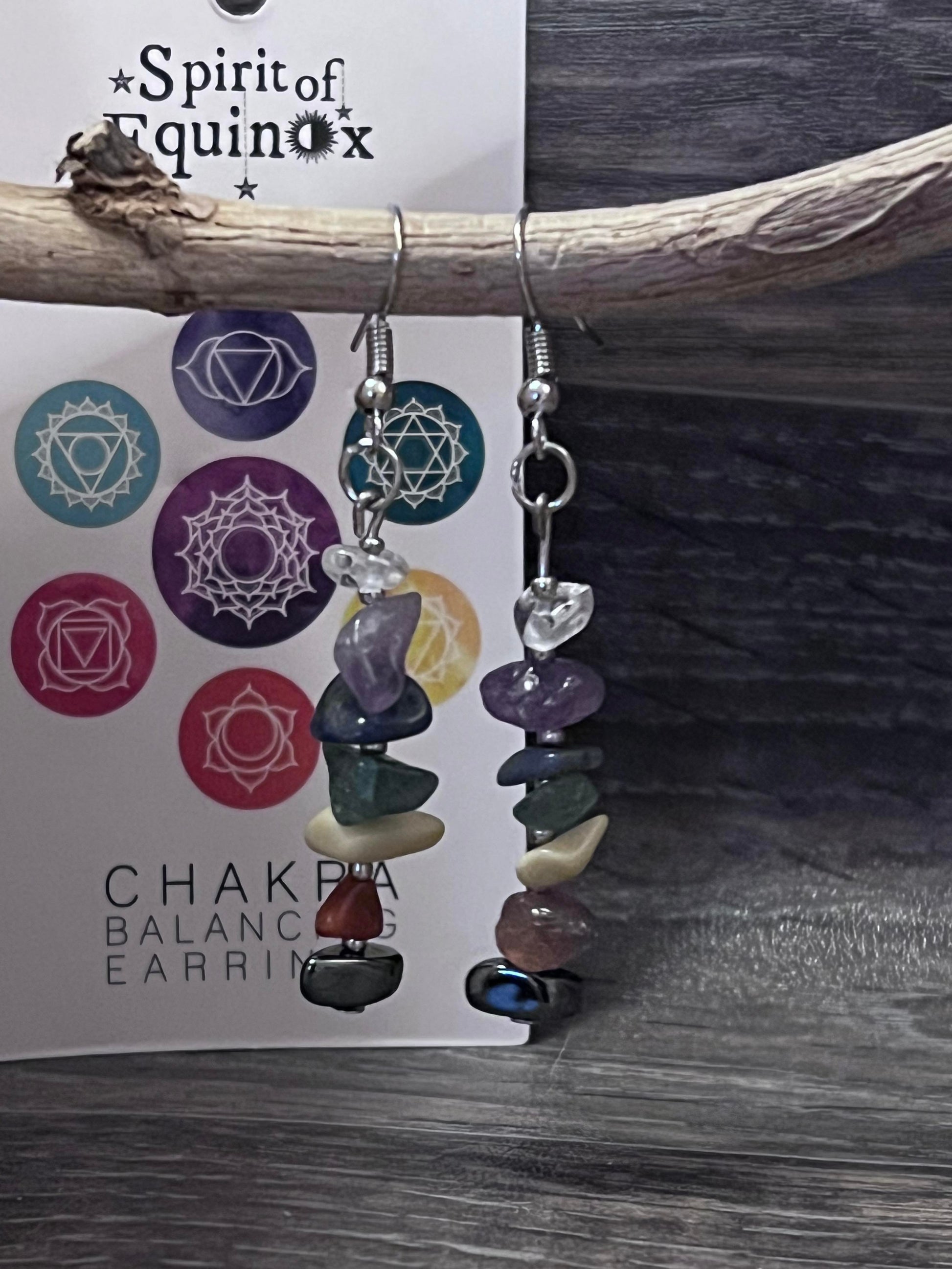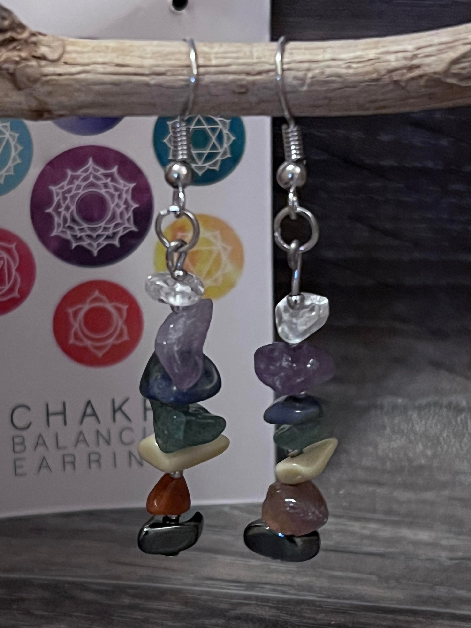 These beautiful Chakra earings are made of up seven semi precious stones each representing the seven chakras. Presented on a designed display card. Often recommended for people who practice yoga or Reiki to help enhance their spiritual and physical wellbeing. Jewellery stones include hematite (root chakra), carnelian (sacral chakra), yellow jade (solar plexus chakra), green adventurine (heart chakra), lapiz lazuli (throat chakra), amethyst (third eye chakra) and clear quartz (crown chakra).