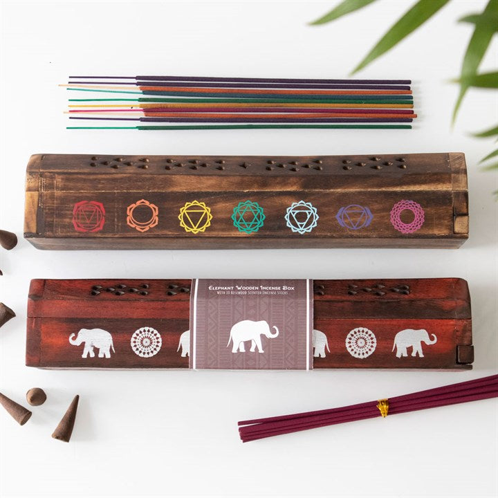This incense gift set includes 10 rosewood fragranced incense sticks in a mango wood box. Printed with white elephant silhouettes and mandala designs, this box doubles as both an incense holder and storage.