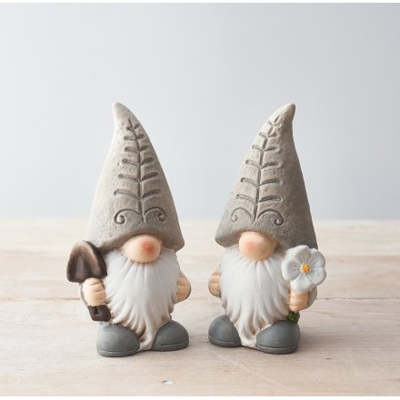 Gardening gonk ornaments made from terracotta. Each has a pretty leaf printed hat and is holding either a flower or gardening tool.