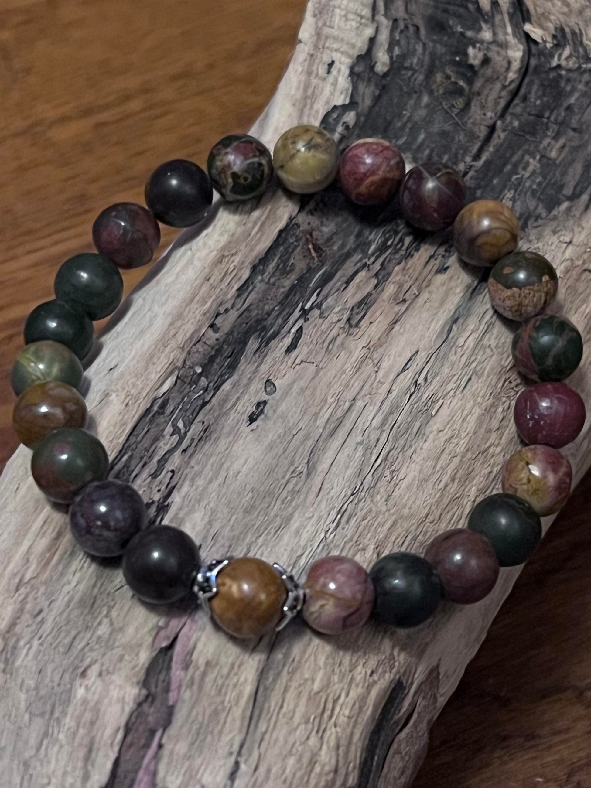 Handmade by Cariad & Cwtches, this beautiful bracelet is made using natural Picasso Jasper 8mm crystal beads. The colours and patterns of this particular type of Jasper are amazing.