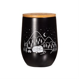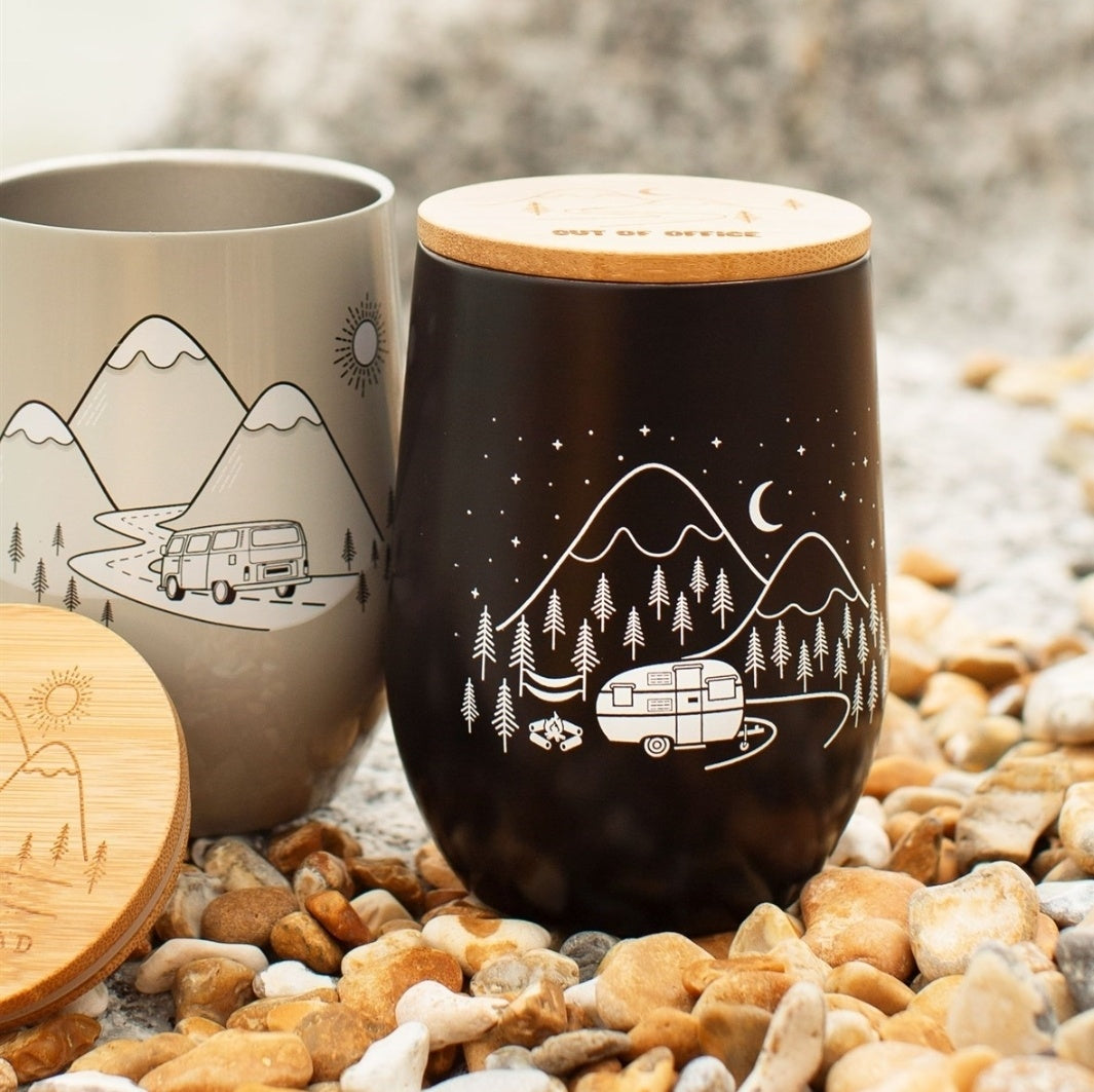 We love everything about these travel mugs. Stainless steel doubled wall casing, keeps your drinks hotter for longer. The leak proof Bamboo lid features a charming "out of tge office" wording and design.