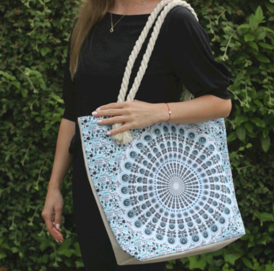 This charmingly patterned Mandala Bag is large enough for storing all of your essentials. It has small pocket inside, two shoulder straps and fastening at the top with a zip. It will be perfect for shopping and also for a beach.