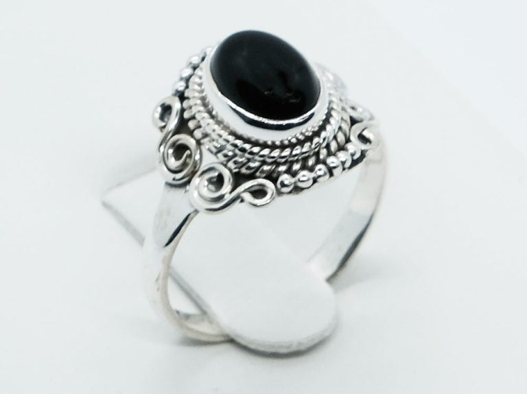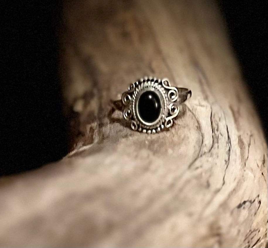A black Onyx gemstone sits in an ornate designed, 925 sterling silver ring. Simply gorgeous.