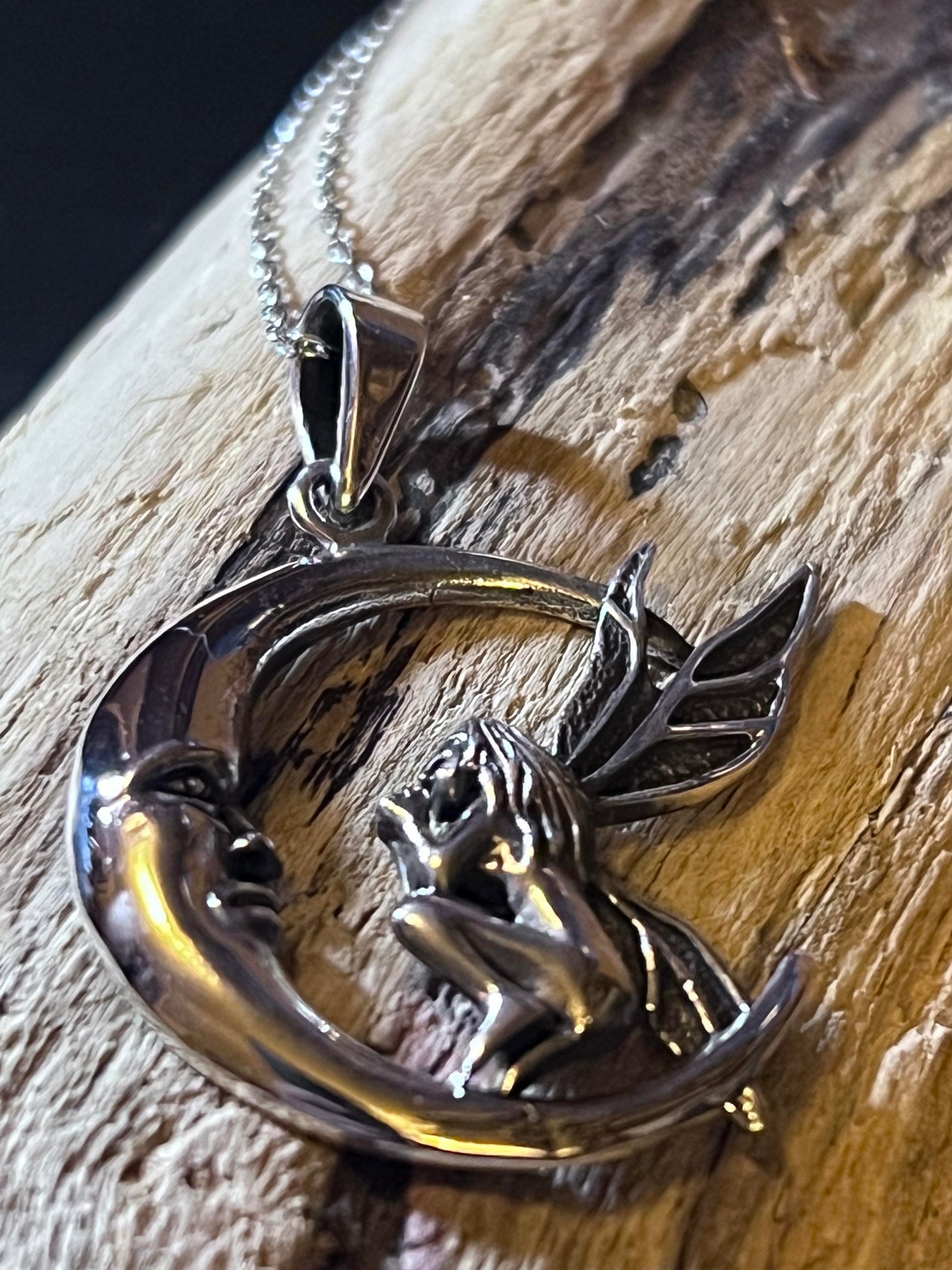 This gorgeous pendant features a cute littles winged fairy sitting on a half moon. A beautiful gift for anyone who believes in the magic all around us. Choose a black leather effect cord necklace or upgrade to an 18 inch sterling silver chain.