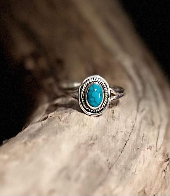 A stunning Turquoise gemstone sits beautifully in this oval shaped 925 sterling silver ring.