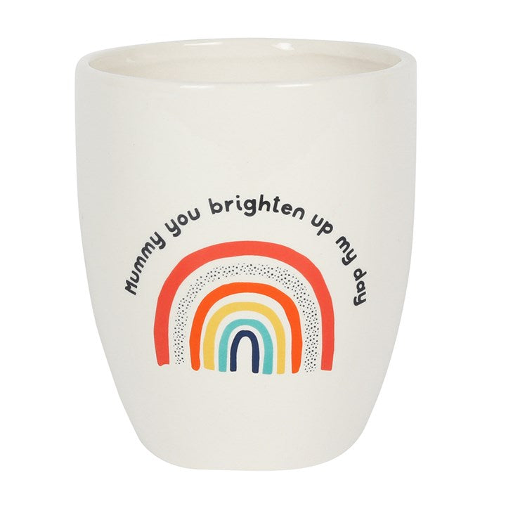 A beautiful contemporary gift for a little one to give for Mother's Day, or any occasion, as a reminder of how loved and appreciated she is. This white ceramic plant pot has a rainbow design as the quote 'Mummy you brighten up my day'.