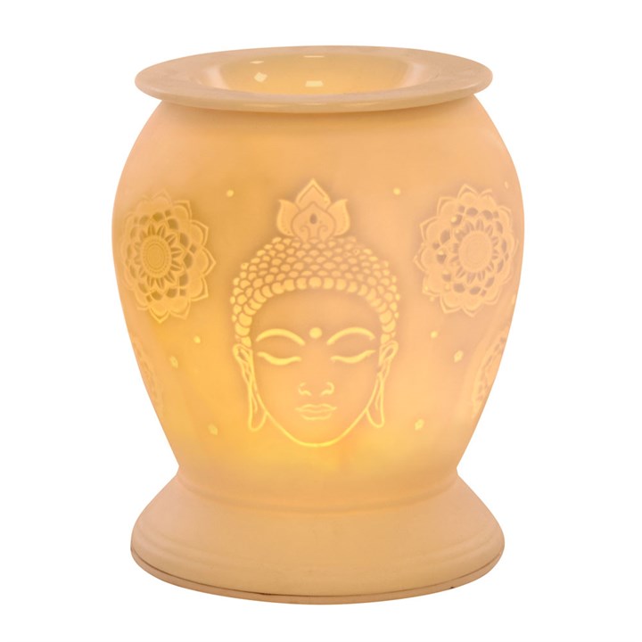 Elegant yet understated, this white ceramic electric oil burner would compliment a variety of homes or could even be used in a relaxation or wellness centre thanks to its Buddha design which is softly illuminated when the lamp is turned on. Use with either fragrance oils or wax melts. Part of a collection of white ceramic home fragrance accessories. UK mains electric plug.