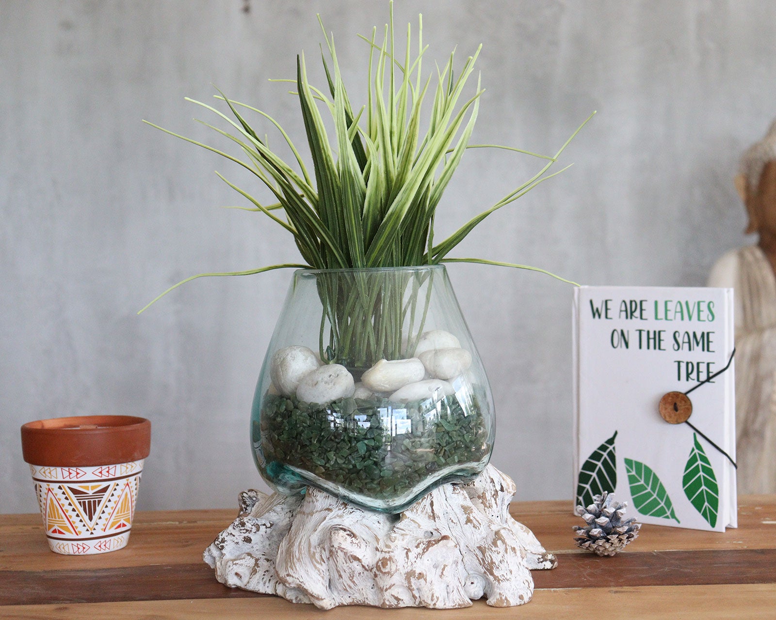 Probably the biggest thing out of Bali in years, in Holland already a massive trend. Everything house plant related and natural is a major trend, and this beautiful and natural product is right on the button. They are crafted by hand in Bali from recycled glass and Balinese Gamal wood. This stunning, molten art glass vase brings the best of two worlds together: natural and man-made; earthy and chic; practical and spiritual.